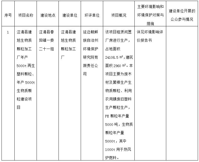 汪清县建旭生物质颗粒加工厂年产5000t再生塑料颗粒、年产5000t生物质颗粒建设项目环境影响评价报告书拟审批意见的公示