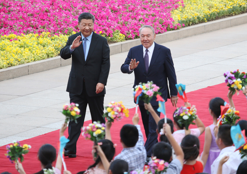 6月7日,国家主席习近平在北京人民大会堂同哈萨克斯坦总统纳扎尔巴耶夫举行会谈。这是会谈前,习近平在人民大会堂东门外广场为纳扎尔巴耶夫举行欢迎仪式。新华社记者 姚大伟 摄