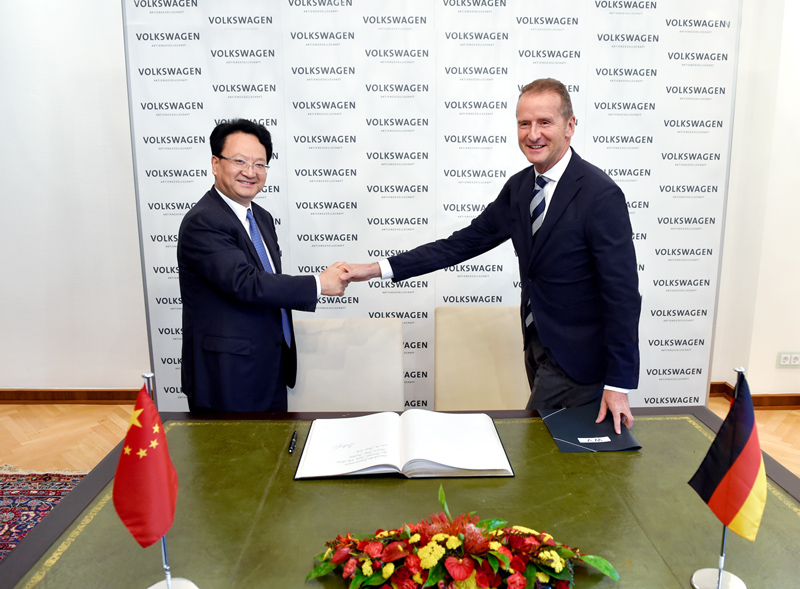 图为景俊海与大众集团董事长、大众汽车乘用车品牌董事长迪兹深入对话洽谈,并就相关合作事宜达成共识。邹乃硕 摄